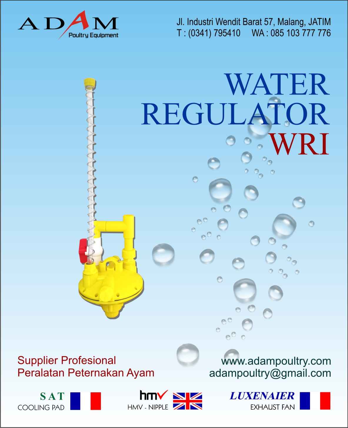 Water regulator WRI berfungsi untuk mengatur debit air sesuai dengan umur ayam dan dapat terbagi secara merata sehingga kebutuhan minum ternak ayam anda akan terpenuhi secara efisien. Penggunaan water regulator cocok untuk kandang baru atau kandang upgrade dengan sistem air minum otomatis menggunakan Nipple.